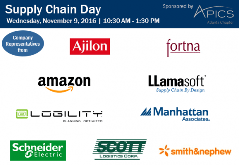Supply Chain students, please join us for our second Supply Chain Day of the semester! The 3-hour session will host supply chain representatives from APICS, Ajilon Professional Staffing, Amazon, Fortna, Llamasoft, Logility, Manhattan Associates, Schneider Electric, Scott Logistics, and Smith & Nephew who will be on campus to educate ISyE students about their organizations and available employment and networking opportunities.