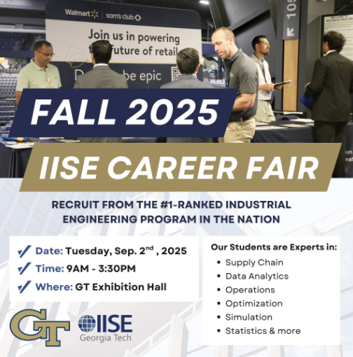 Looking for internships or full-time roles? This is your chance to meet leading employers and explore exciting career opportunities in Industrial & Systems Engineering. For more information and to submit your resume, visit https://www.gtiise.org/career-fair-info.