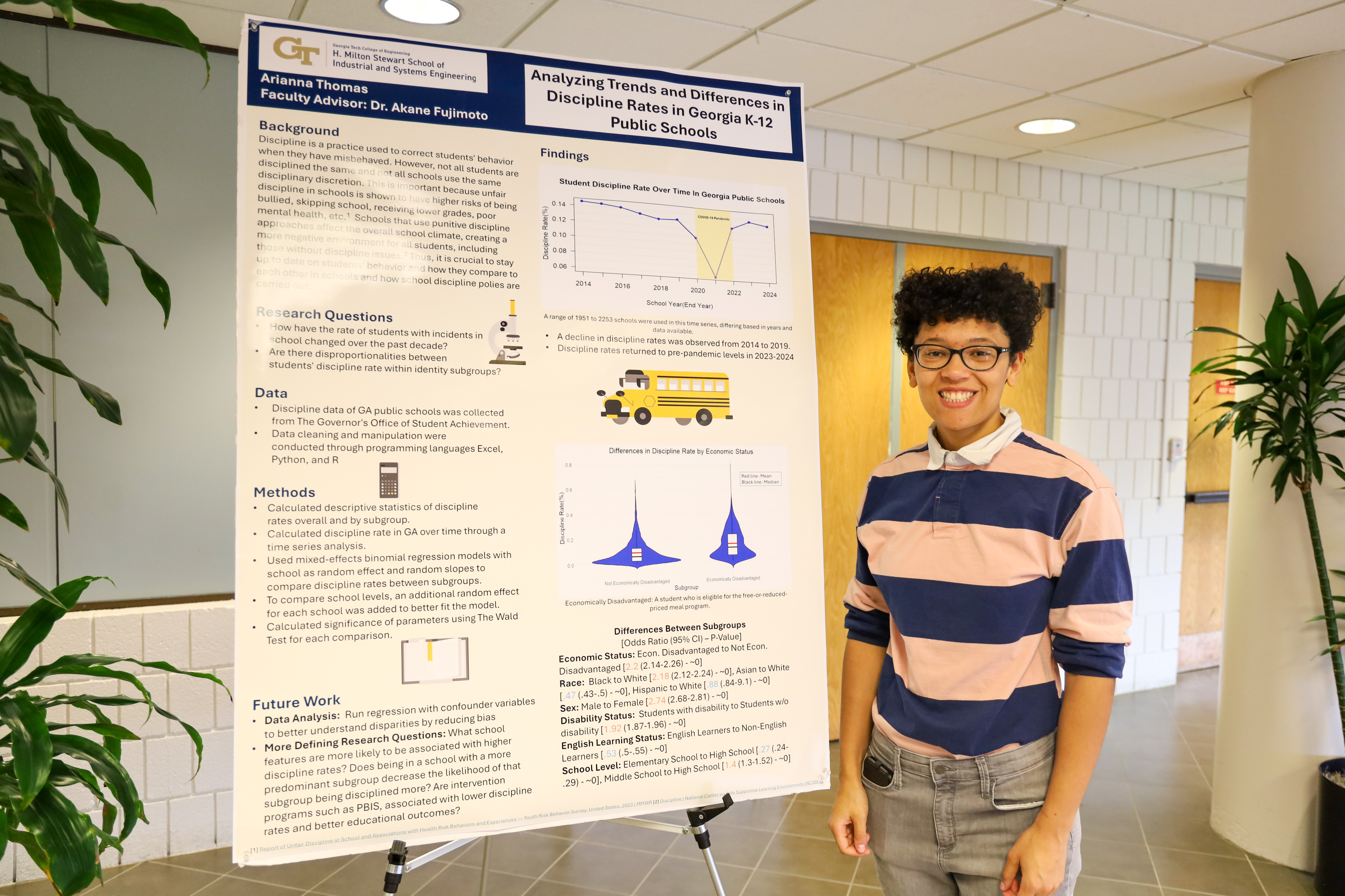 - Arianna Thomas – Advisor: Akane Fujimoto Wakabayashi- Analyzing Trends and Differences in Discipline Rates in Georgia K-12 Public Schools - This study focuses on examining disciplinary trends in Georgia’s K-12 public schools. Utilizing data collected from the Governor's Office of Student Achievement, they analyzed discipline rates over time using time series and compared rates across various demographic groups using mixed-effects binomial regression models.